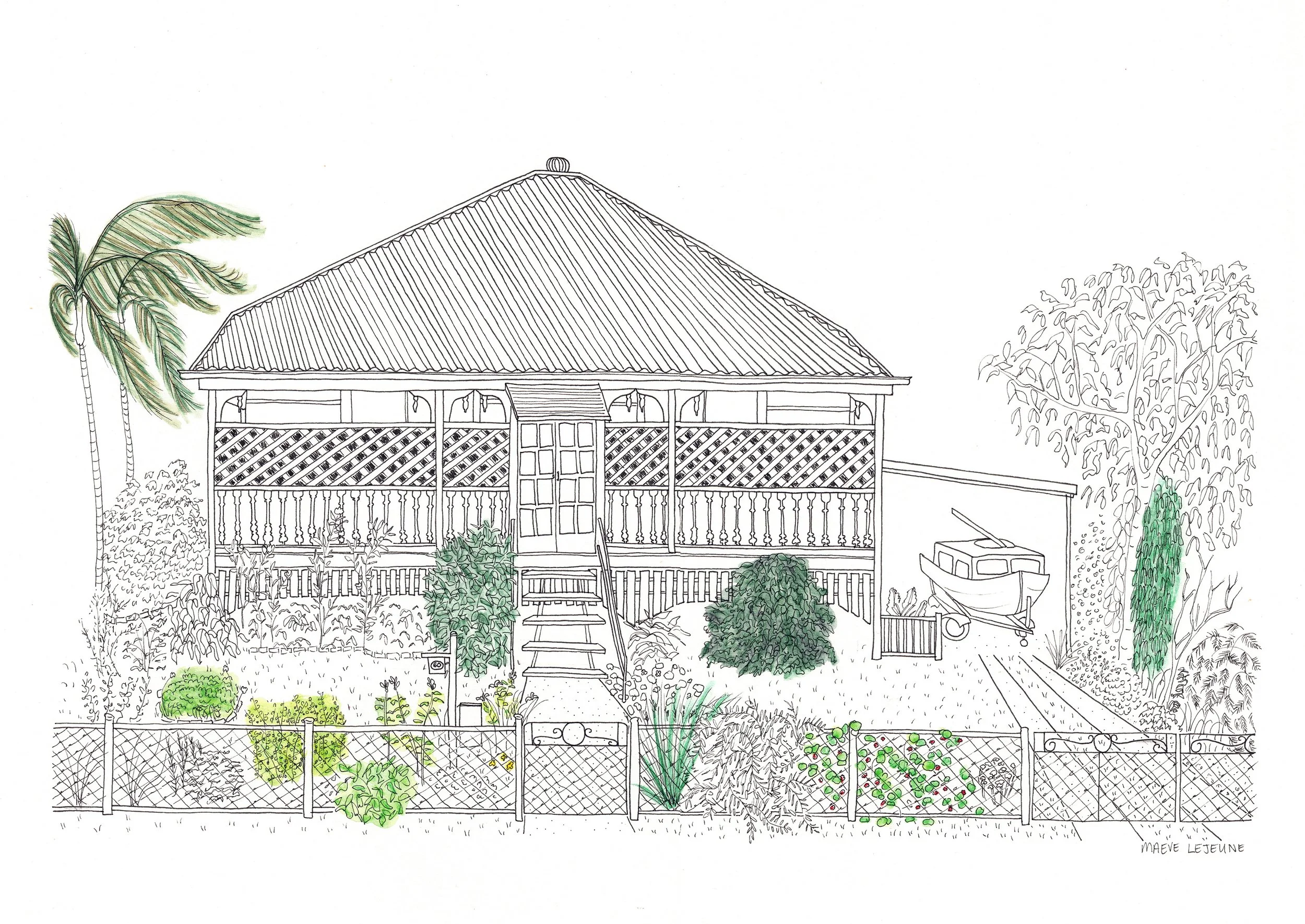 This house was for Annie’s parents. A lovely cottage in Dutton Park, this portrait was a joy to draw! It has lots of fun garden features, some lattice (not the most fun thing to draw) and her dad’s boat in the driveway.
