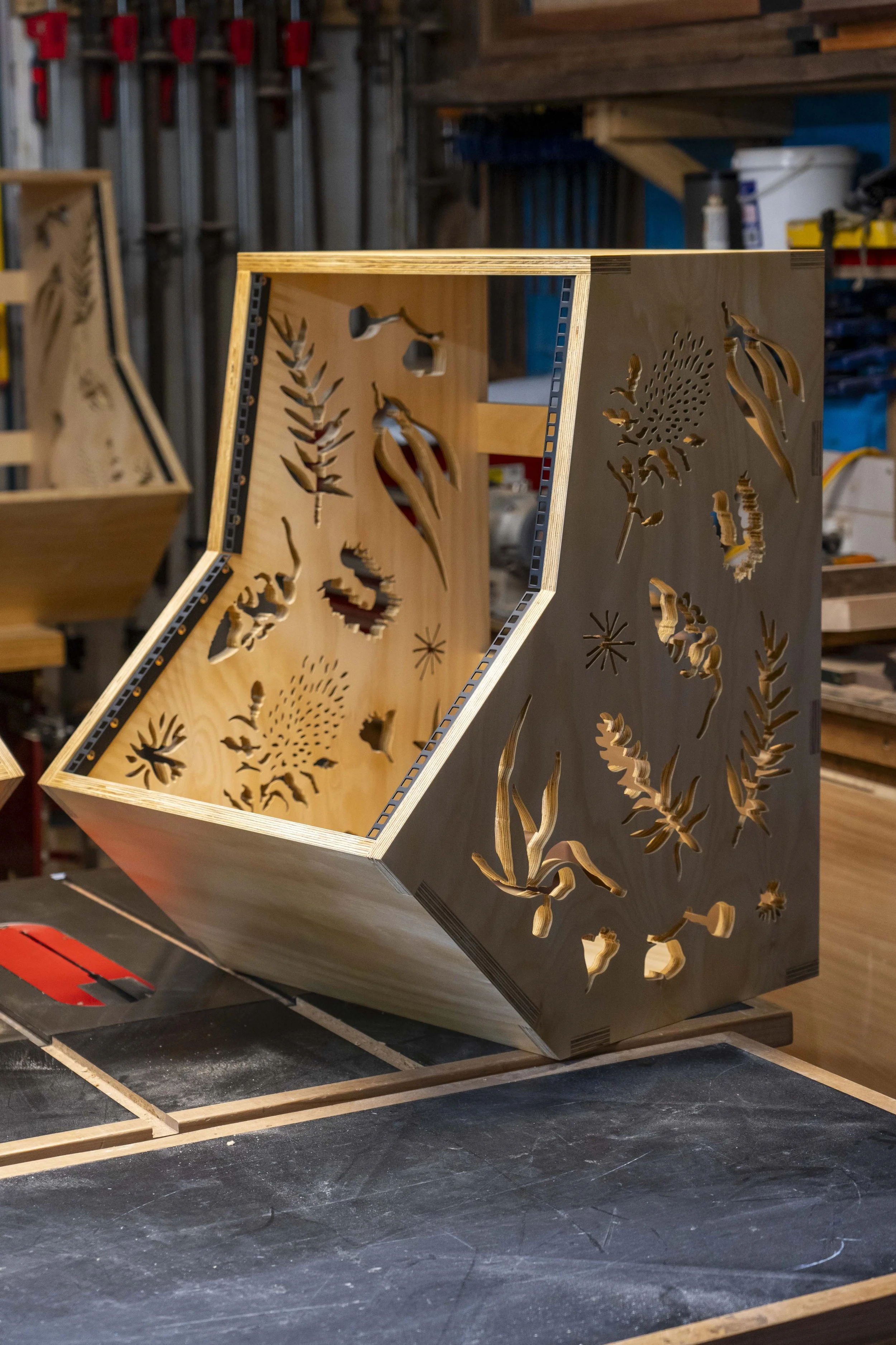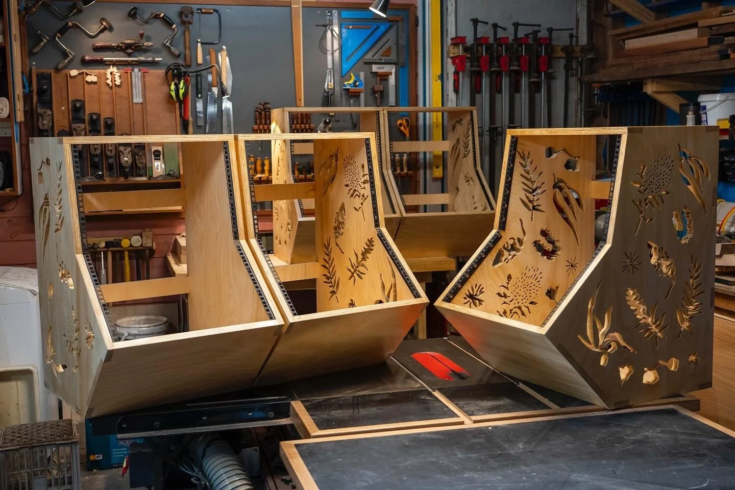 Marley asked my partner, Angus, if he could create some custom studio racks for his sound recording equipment. It’s normal for the cabinetry that holds musical equipment like this to have cut outs on the sides to allow for airflow so the equipment doesn’t overheat. Marley’s vision was for the cut outs to be native Australian plants.